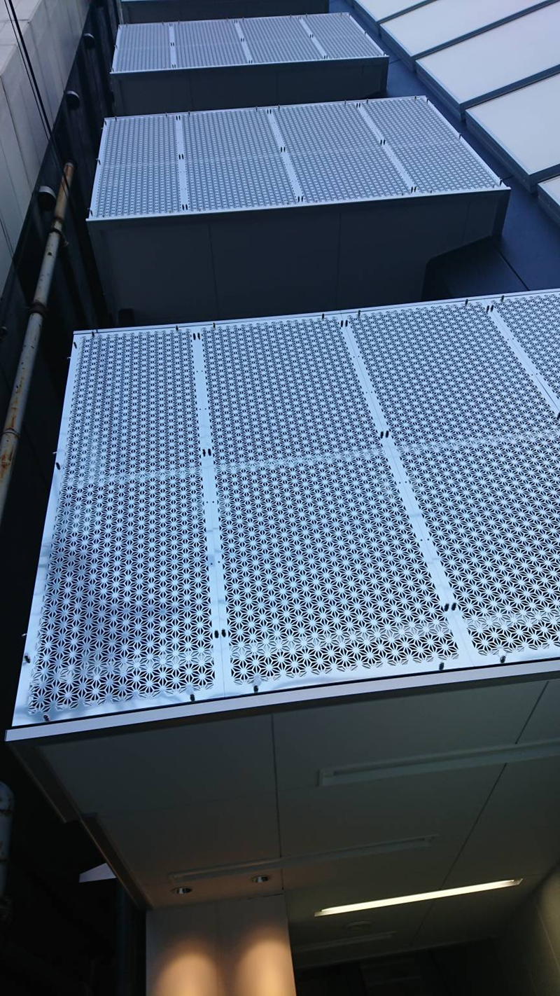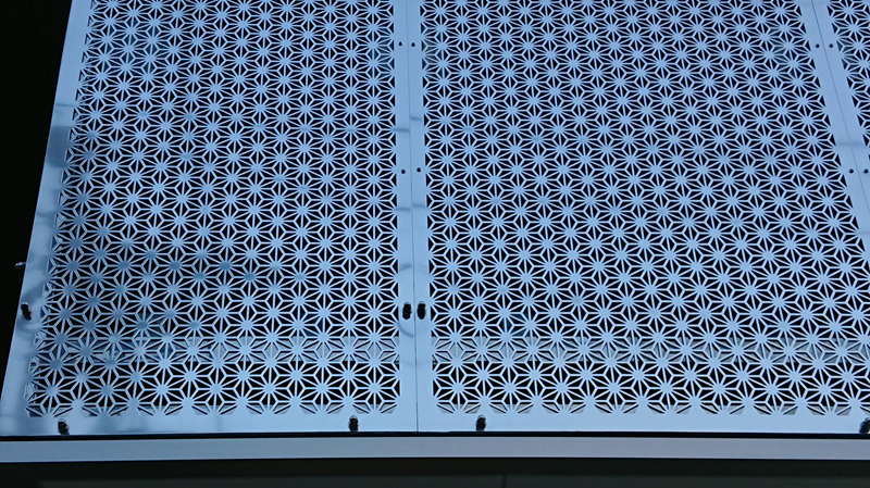 材質を光輝アルミ合金(257S-H24)で加工し、表面処理を電解研磨+アルマイトシルバーにしたことでSUS304 鏡面仕上げと同等以上の美しい仕上げを実現した。 パンチングデザインも麻の葉柄で加工したことでより意匠性・デザイン性に富んだ仕上がりとなっている。 AL 257S-H24 2.0t 麻の葉柄模様 電解研磨+アルマイトシルバー